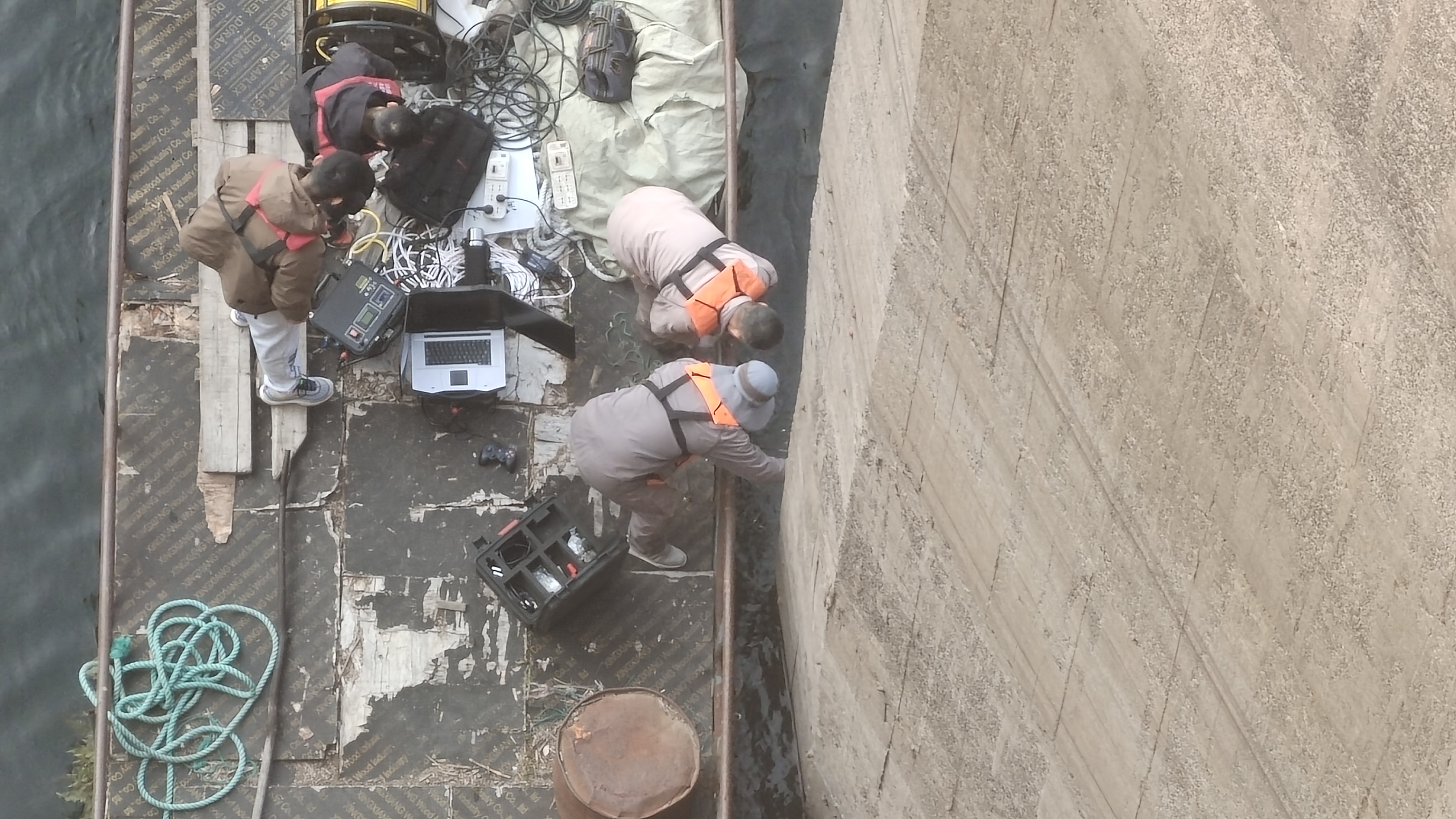 在大坝安全检测环节,专家组对大坝坝体、坝基、溢洪道、泄洪洞等核心建筑物进行全面细致勘查。重点核查了大坝外观完整性、结构稳定性、渗流安全情况及金属结构运行状态,仔细查看了坝顶路面、排水系统、观测设施等附属工程运行情况,并详细记录了相关数据参数。此次检测突出科技赋能优势,充分运用现代智能化检测手段,利用无人机对大坝迎水面、检修闸门等重要设施设备进行高清拍摄与初步分析,同步借助水下无人机对坝体水下部分进行探查,初步获取了大坝表面及水下结构的影像与数据。