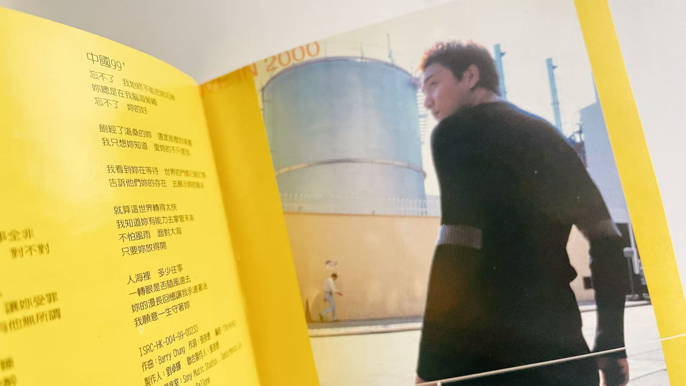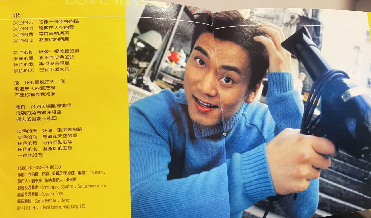 一、这张专辑的“洋气”,先从封面开始。90年代的内地歌手封面,要么是棚拍的浓妆造型,要么是山水间的“抒情摆拍”,但《爱在2000》直接把场景搬到了香港街头:背景里的路牌、报刊亭、疾驰的车辆,衬着林依轮收窄的肩线和垂坠感的裤子,像极了当时TVB剧里的都市男主。最点睛的是那只拉布拉多——后来才知道它是香港某宠物机构的“明星犬”,名叫“阿黄”,特意借来拍摄以强化“松弛的都市感”。明黄色的右侧色块撞开了传统专辑的沉闷,连CD盒上的BMG标志都透着“国际厂牌”的精致,和当年满大街的盗版磁带比,这张专辑光是拿在手里,都像攥着一张“潮流入场券”。